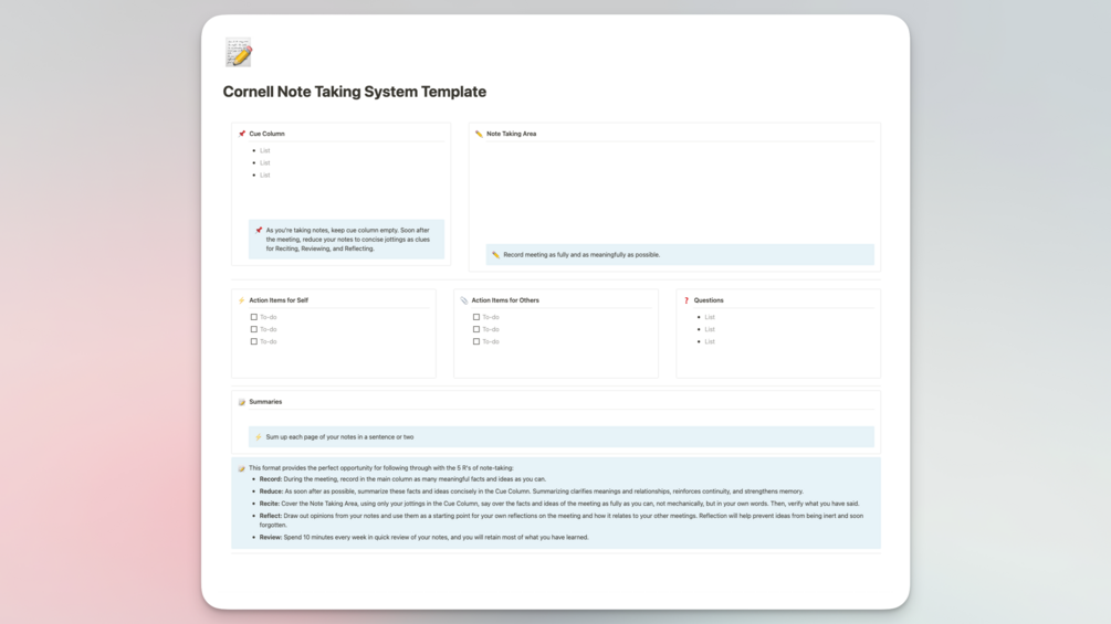 📝 This format provides the perfect opportunity for following through with the 5 R's of note-taking: