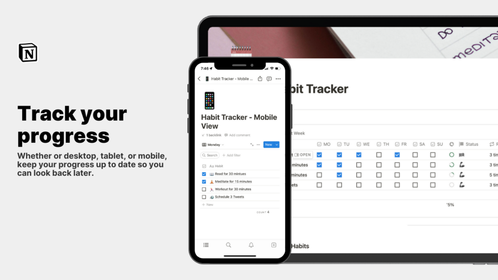 Keep track of your progress with our user-friendly habit tracker. Whether on desktop or mobile, record your progress and look back on that later.