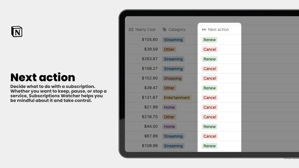 Check your current subscription inventory at a glance. See renewal dates, monthly and yearly costs, categories, and next actions for each subscription.